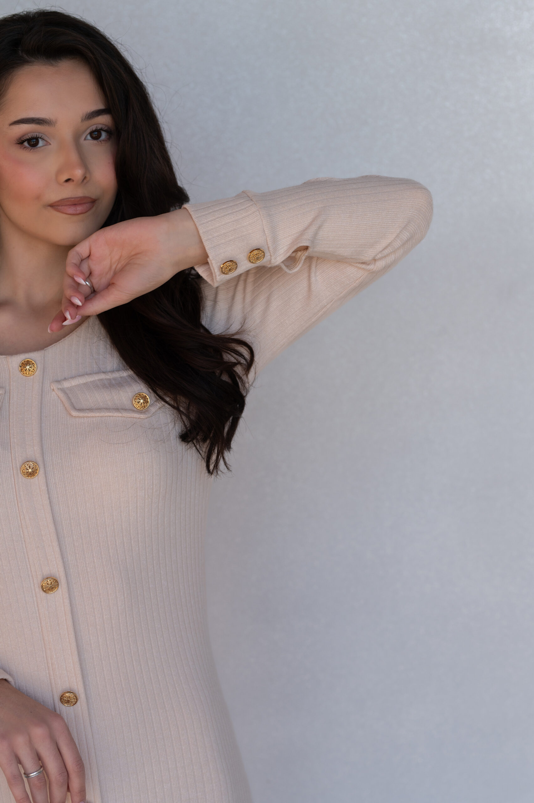 Dzianinowa sukienka Selene to delikatna i kobieca propozycja na nadchodzącą wiosnę, która będzie idealna na każdą okazję. Selene została wykonana z elastycznej i bardzo efektownej dzianiny o naturalnym składzie. Materiał pięknie się układa w ruchu, jest wyjątkowo miękki i nie krępuje ruchów. Elegancji dodają złote, ażurowe guziki, które zdobią mankiety rękawów sukienki oraz przednią listwę, po całej długości sukienki. Sukienka nie jest rozpinana, co gwarantuje wysoki poziom komfortu noszenia, bez obawy, że sukienka będzie się rozchodzić lub rozpinać. Ciekawego wyglądu dodają klapy po obu stronach klatki piersiowej, które również zostały wykończone biżuteryjnymi guzikami. Dzianina nie prześwituje, jest mięsista, a zarazem lekka.
