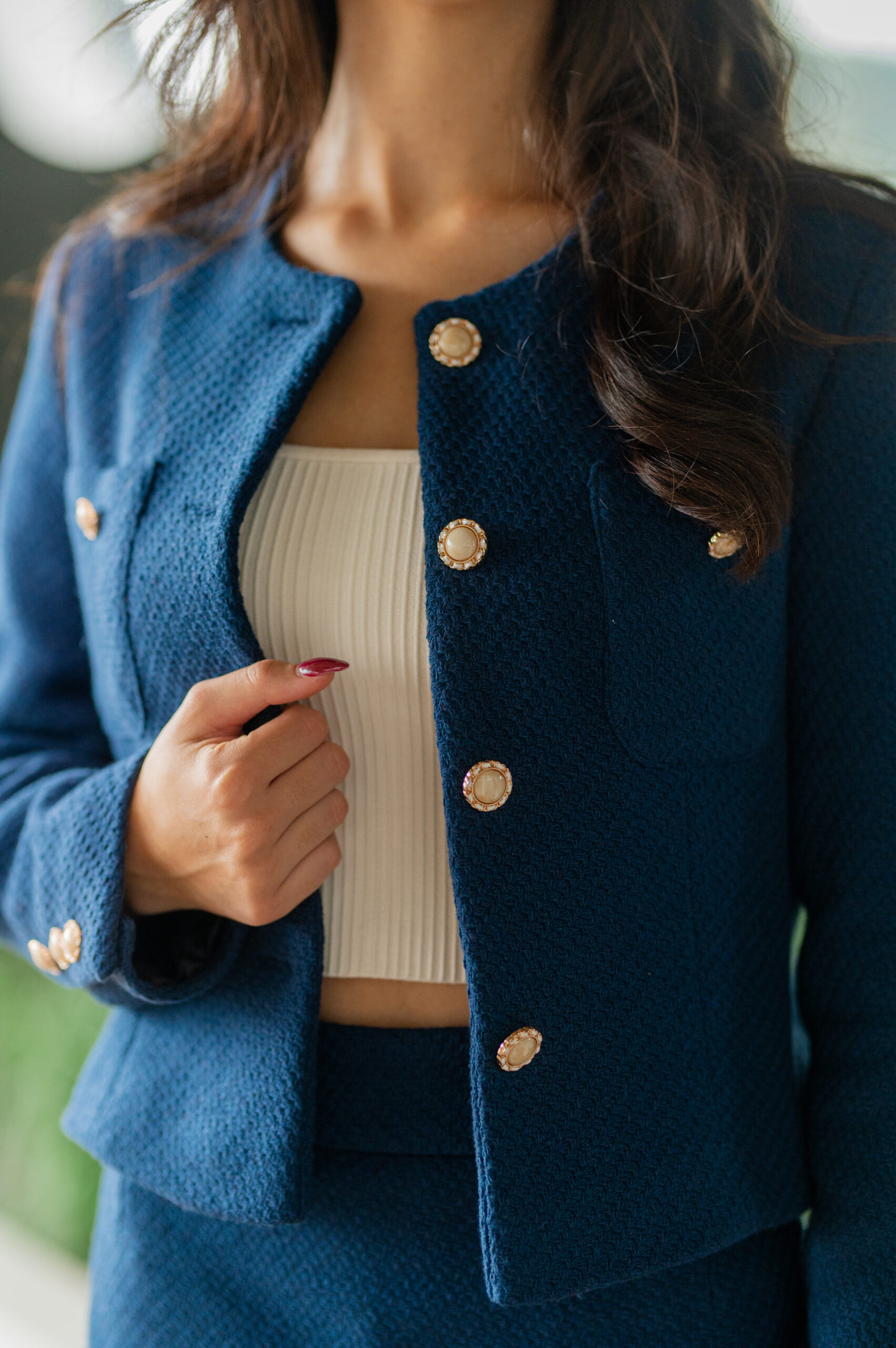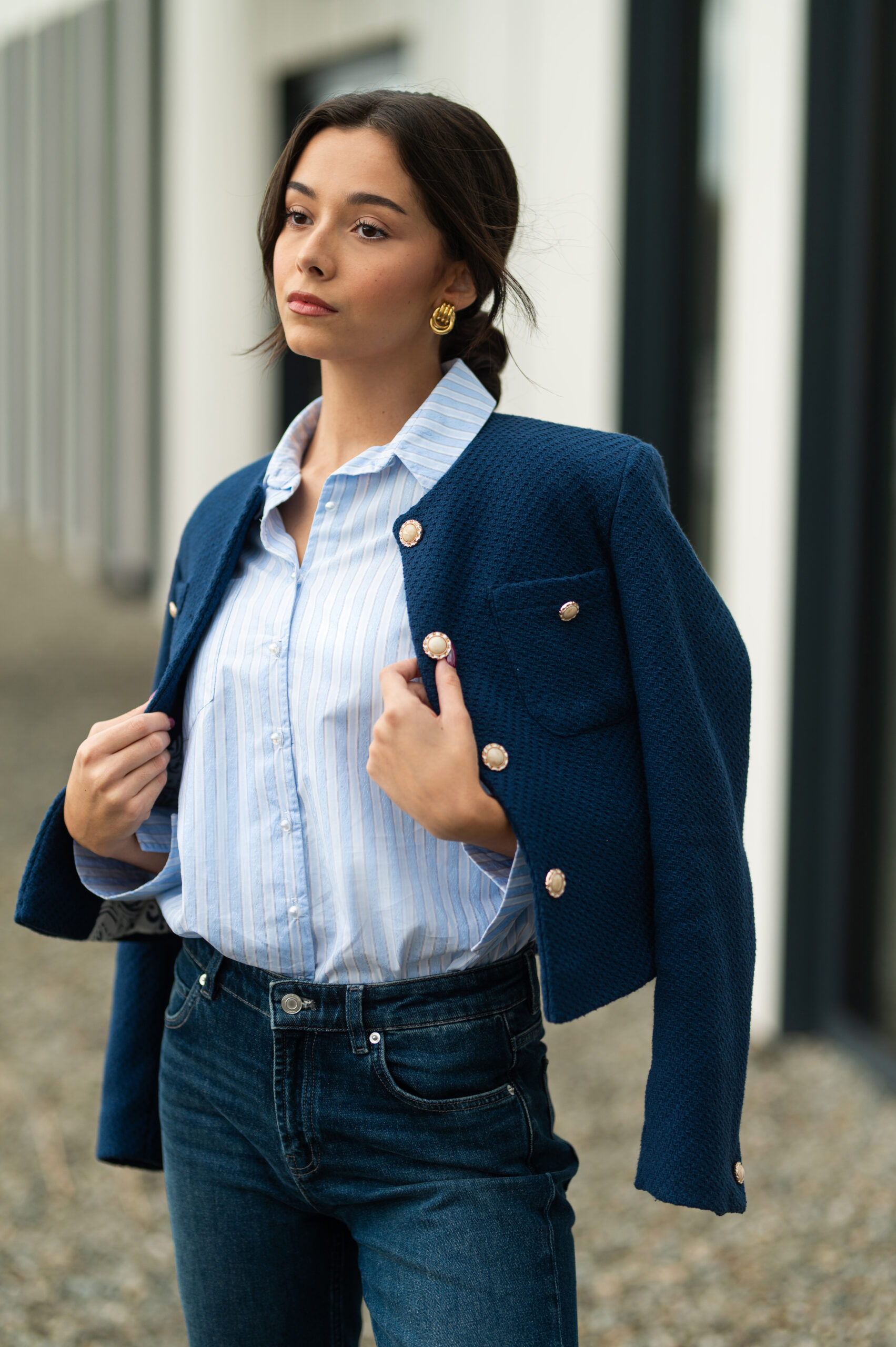 Klasyczny żakiet typu chanelka o pudełkowym kroju w przepięknym głębokim granatowym kolorze. Materiał zachwyca swoją strukturą. W składzie znajdziemy naturalną mieszankę bawełny, wiskozy i wełny. Jest przyjemny w dotyku i oddychający dla skóry. Żakiet posiada ozdobną, bawełnianą podszewkę w uroczy wzór typu paisley, która dodaje wyjątkowego charakteru całości. Zapinany jest z przodu na biżuteryjne, złote guziki imitujące labradoryt  nadające luksusowego akcentu. Po bokach dwie kieszonki. Poduszki na ramionach. Do żakietu idealnie pasuje nasza mini tweedowa spódnica Carla, zestawione razem tworzą spójny komplet. Żakiet zabierzesz do pracy, na spotkanie, czy randkę – jedno jest pewne, nie potrzeba wiele, by wyglądać oszałamiająco i z klasą, o czym świadczy na nowo spopularyzowany styl old money. Łatwość zestawienia go z różnymi elementami garderoby to jego dodatkowy atut.