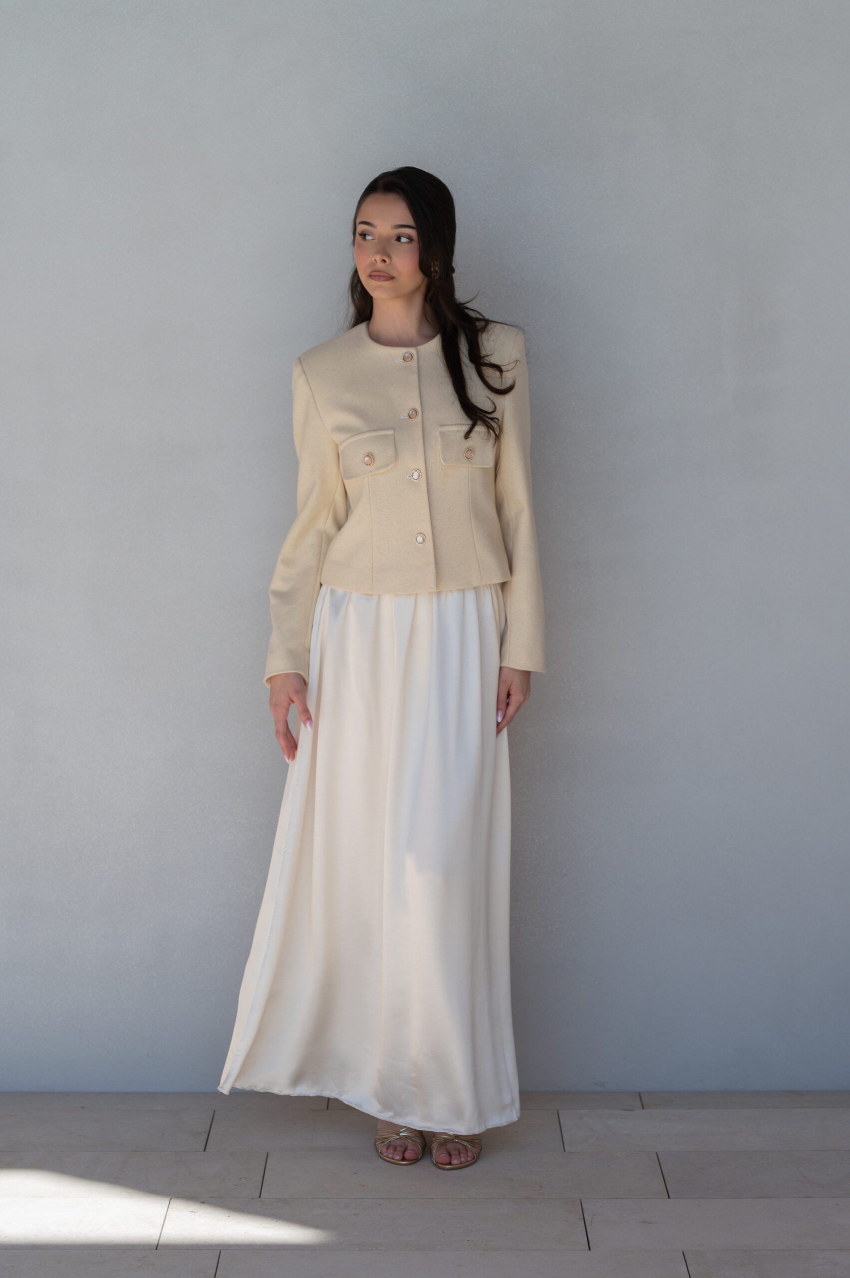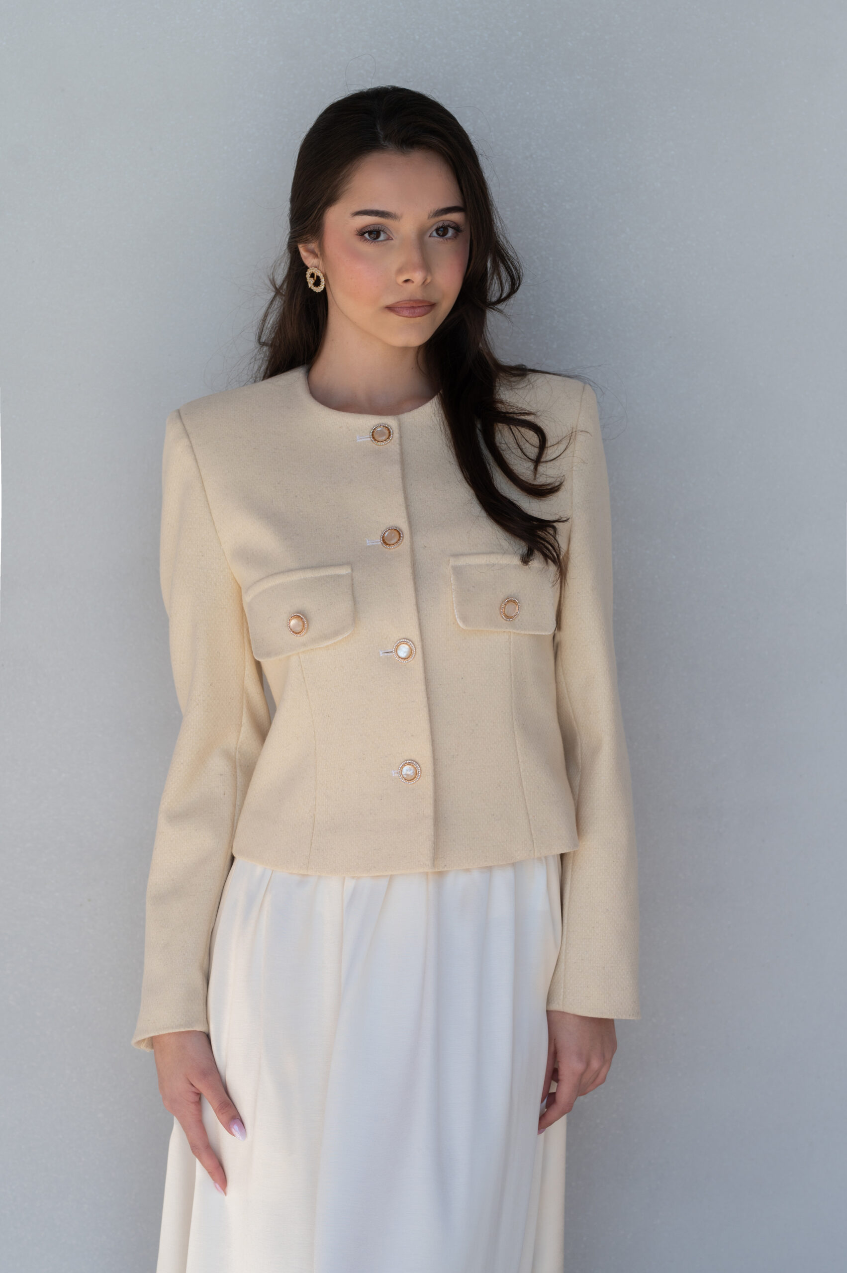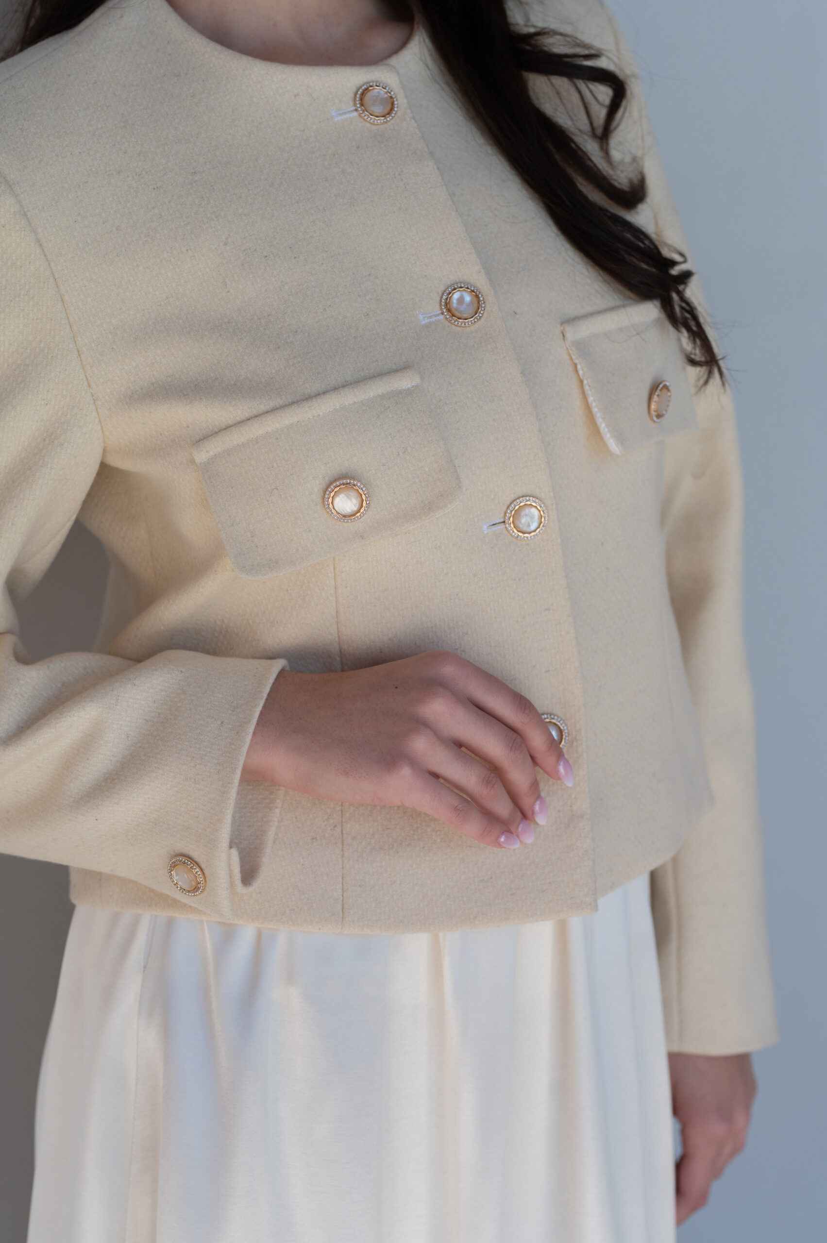 Detale: o pudełkowym kroju,fason typu chanel,